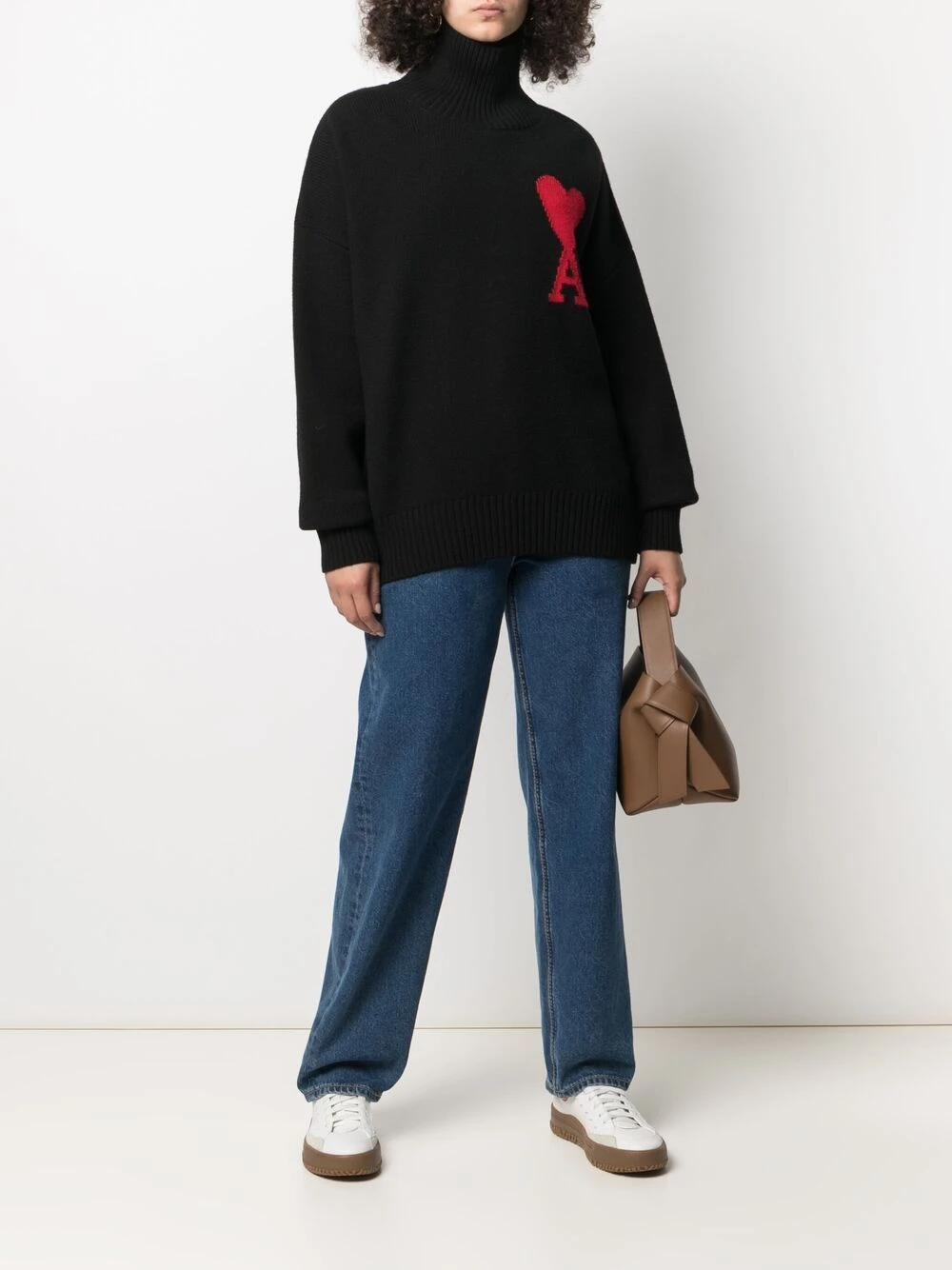 Bord en maille côtelée, maille intarsia, effet d’épaules descendues, manches longues. Couleur : noir. Matière : laine.